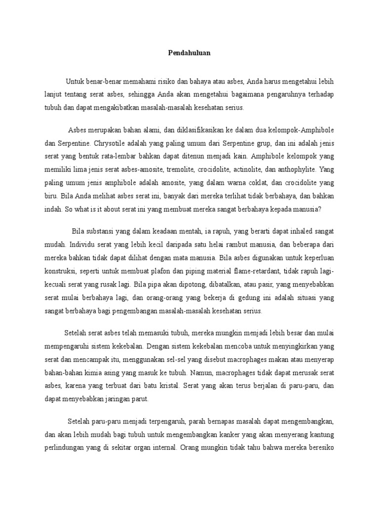 Asbes Atau Asbestos Adalah Salah Satu Bahan In Pada Selaput Paru Paru Yang Sakit Pekerja Yang Terpapar Pdf Document from static.fdokumen.com Asbestosis adalah salah satu penyakit paru yang terkait dengan paparan terhadap asbes dalam kurun waktu yang lama. Asbes adalah bijih mineral alami yang termasuk dalam kategori bahan tambang serat mineral silika. Jumlah kecil serat asbes di udara yang dihirup seseorang saat bernapas tidak akan menimbulkan rasa sakit. Bahaya paparan asbes untuk kesehatan. Pada saat ini terjadi peningkatan permintaan terhadap produk makanan kesehatan, termasuk diantaranya adalah produk pangan yang kaya serat pangan (tarrega et al., 2017). Oleh karena itu, serat asbes dapat dipintal menjadi material bangunan yang mampu bertahan terhadap panas, api, dan. Asbes sendiri saat ini penggunaanya sudah cukup jarang, dan sudah digantikan dengan konstruksi fiberglass. Asbes sendiri merupakan serat silikat tahan panas yang banyak digunakan dalam berbagai industri, pelapis lantai, dan atap, terutama sebelum tahun 1970.